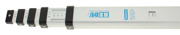 Para medir dimensiones claras con la graduación milimétrica, los elementos se extienden uno tras otro hasta el punto de medición. El resultado de la medición puede leerse fácilmente en la transición al siguiente elemento. Con la ayuda del nivel de burbuja, siempre podrá colocar la regla de medida telescópica en la posición correcta.